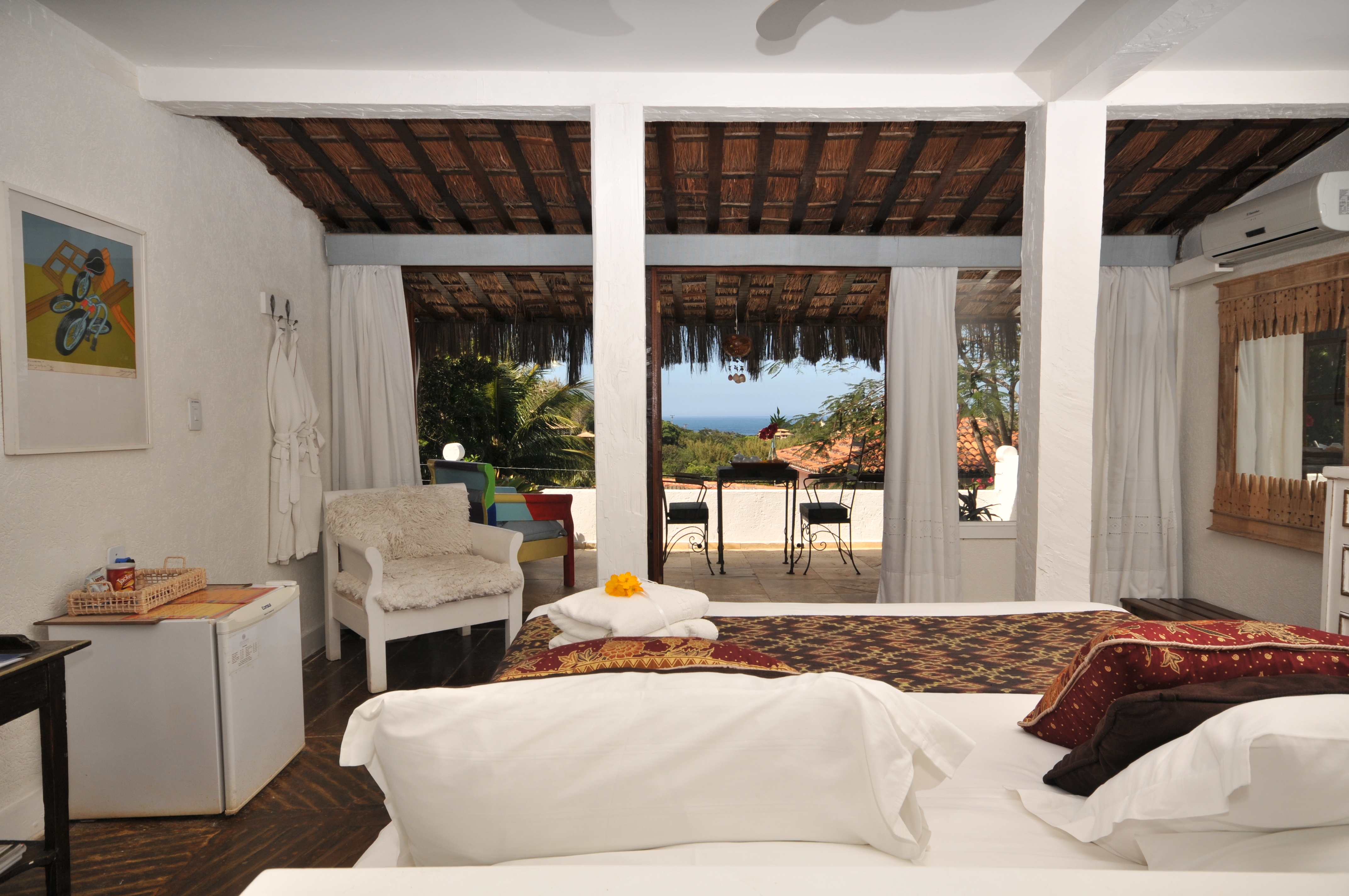 A Suíte Deluxe VIP foi decorada de forma exclusiva, com um bom gosto muito especial e refinado. Bem ampla esta suite possui aproximadamente 30m², já contando com a varanda. Nesta Suite é possível acomodar para casal e mais 2 camas de solteiro. Por estarmos nas colinas de Geribá ela possui uma varanda de onde é possível ver á distância o mar da praia de manguinhos. Nesta mesma varanda existe um confortável e privativa BANHEIRA DE HIDROMASSAGEM, para 2 pessoas.