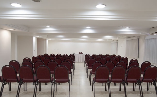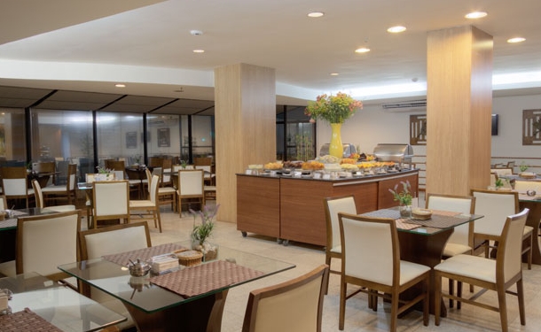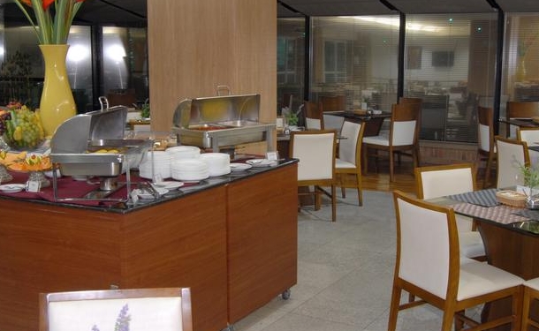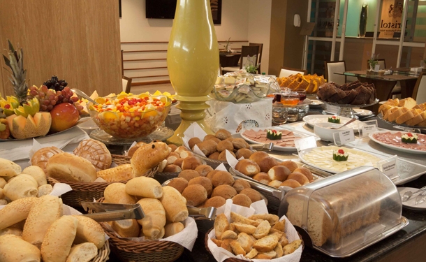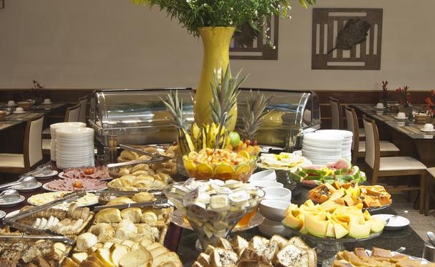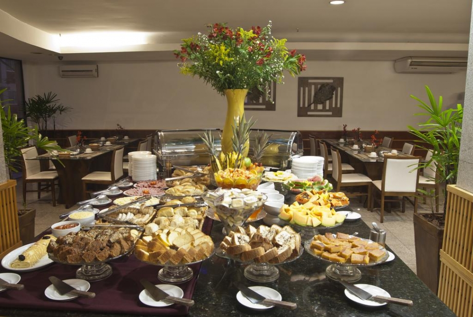 O café da manhã serve pães, bolos, frutas e sucos. O restaurante oferece pratos da culinária brasileira e internacional.