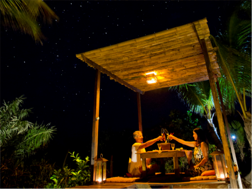 Durante todo o dia você pode degustar petiscos, sucos de frutas regionais e drinks tropicais, como o famoso Mel de Cacau, iguaria encontrada somente na nossa região. Podemos servi-lo no conforto de sua acomodação, no lounge do restaurante, na piscina, ou mesmo na praia. À noite é o ponto de encontro para conversas e observação das estrelas do céu de Arandis.