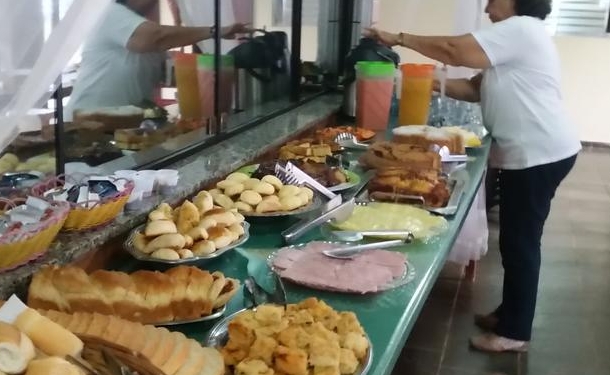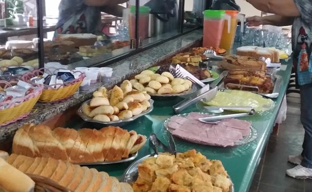 Um Buffet de café-da-manhã com bolos frescos, pães e frios é servido diariamente.
