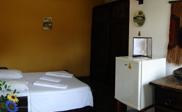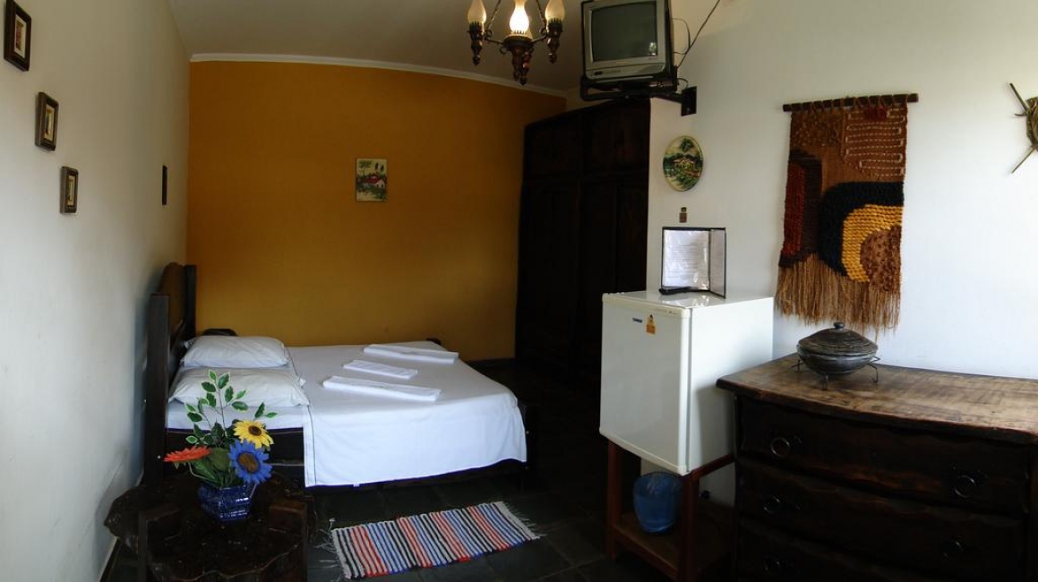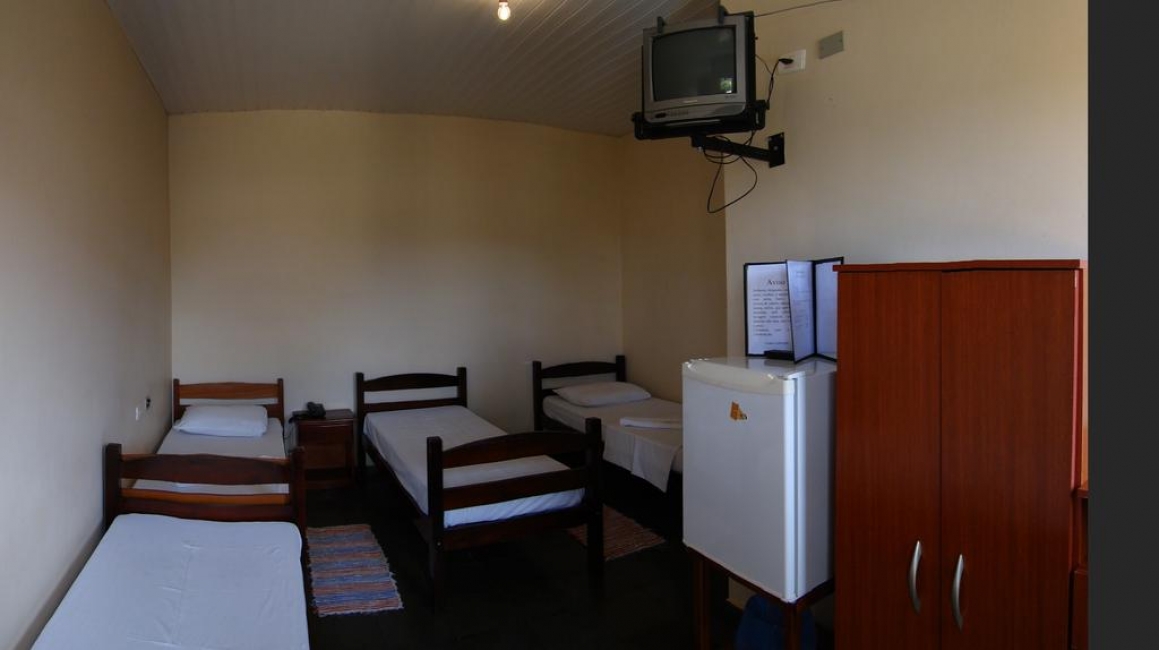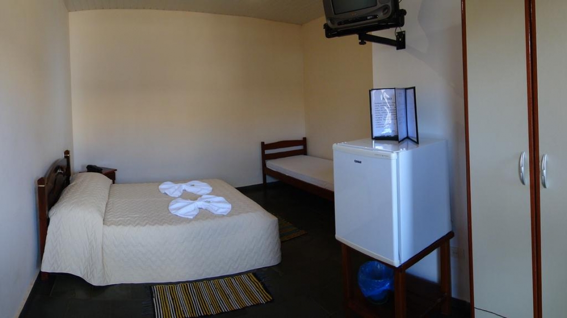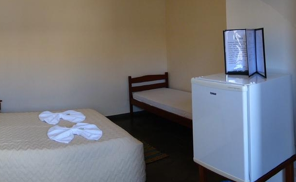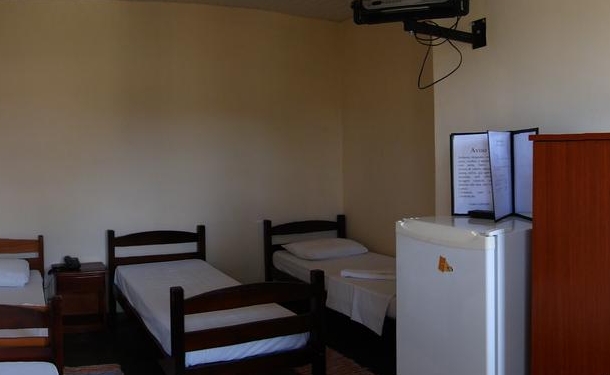 Os quartos do Hotel Refúgio possuem acomodações básicas e contam com ar-condicionado e frigobar.