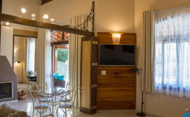 Amplas e confortáveis, as Suítes do Villa Rossa contam com 70m² e solarium privativo. Construídas a partir do conceito de arquitetura sustentável, utilizando madeiras de reaproveitamento e materiais não tóxicos, possuem ainda antessala, máquina de café expresso, decoração diferenciada com painel de pedras e varanda com incrível vista para o bosque. Acomodação para até 4 pessoas.