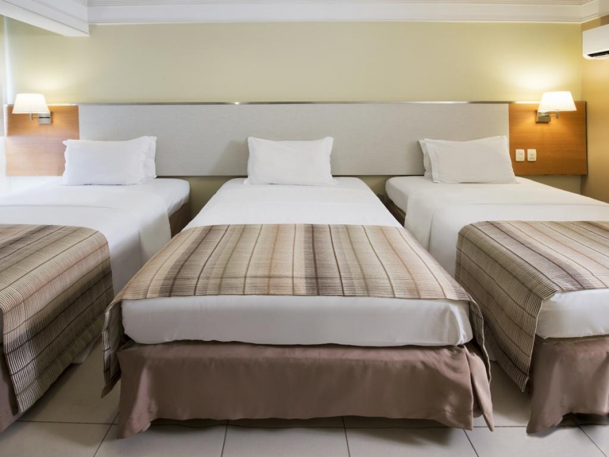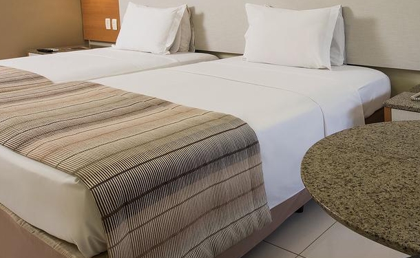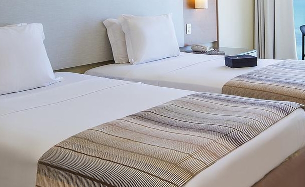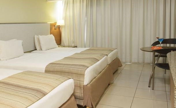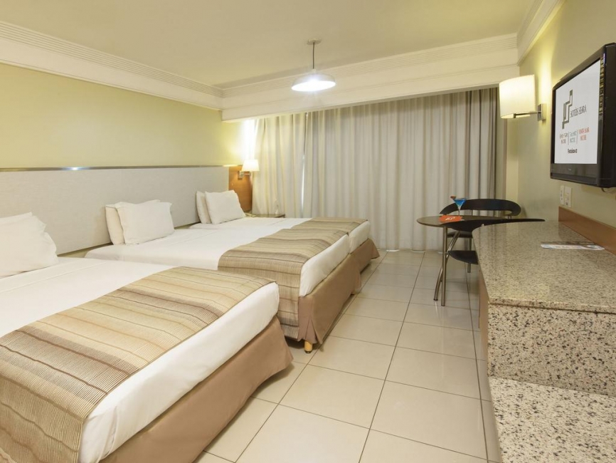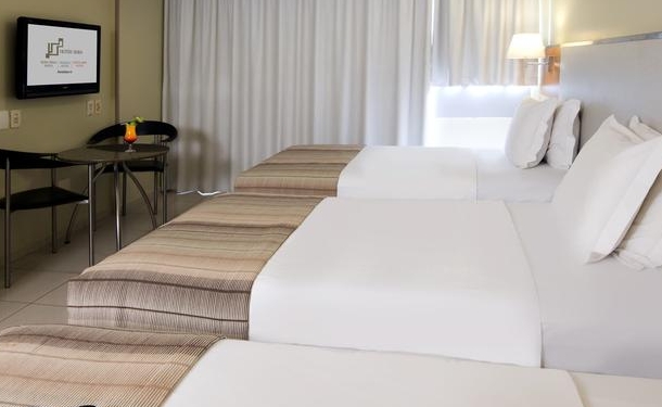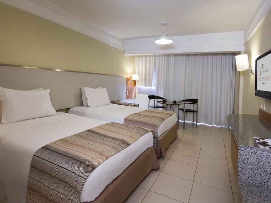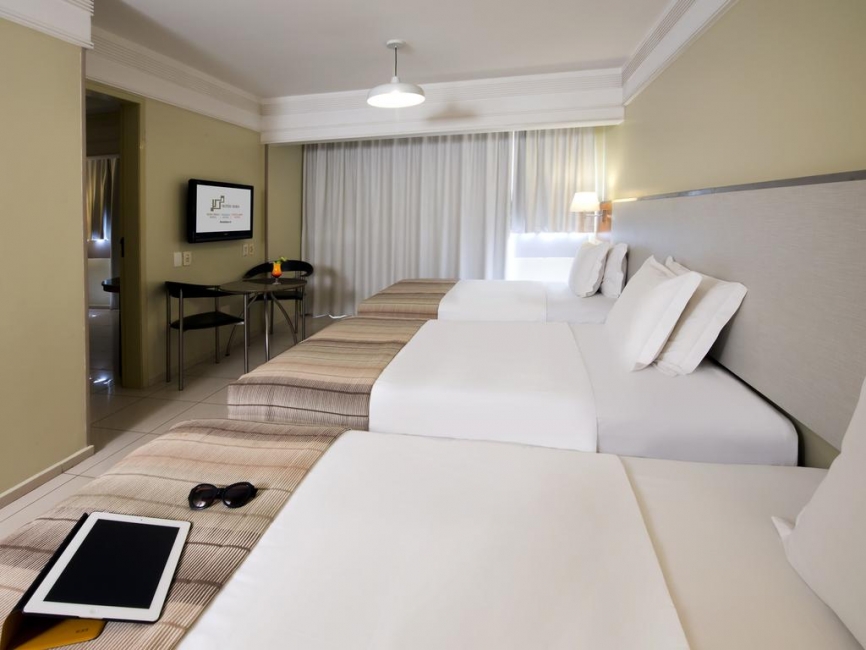 35,4 m² com quarto casal e quarto extra, apartamento decorado com obras de artistas locais, vista piscina (cidade), TV 32” no quarto do casal, TV 32” no segundo quarto, luminárias nas cabeceiras, minibar, correio de voz, serviço de despertar, concierge 24h, telefones no quarto de casal e WC, TV a cabo com 52 canais, cofre eletrônico, internet wi-fi free, 2 aparelhos de ar condicionado individuais, secador de cabelo, cama de casal e solteiro, capacidade para até 4 pessoas por apartamento e room service 24h.
