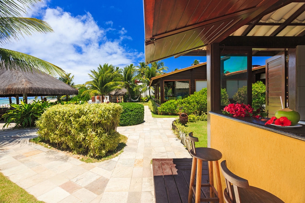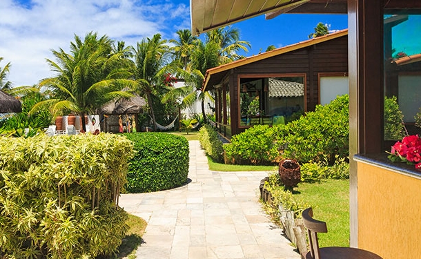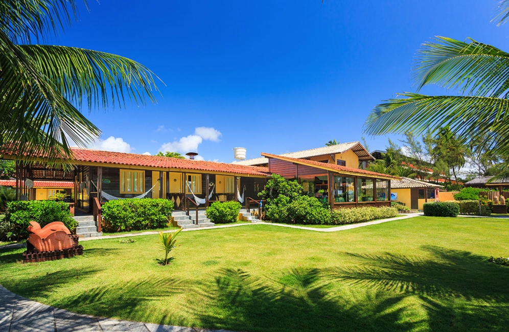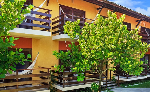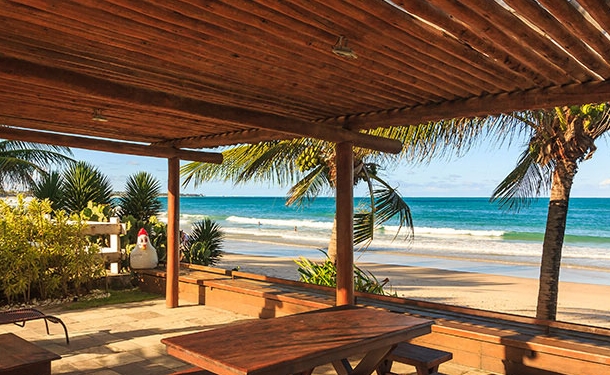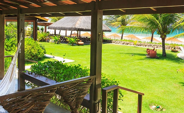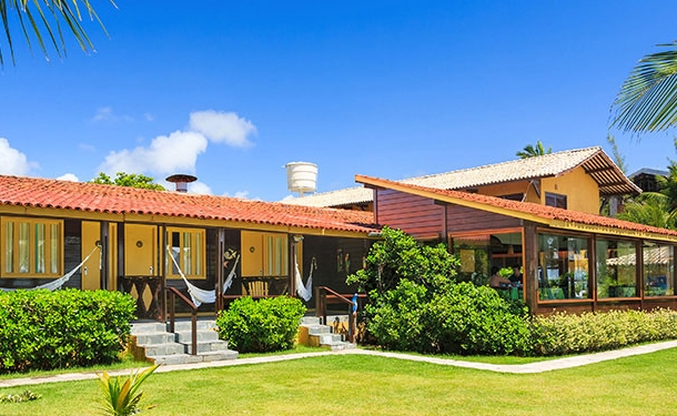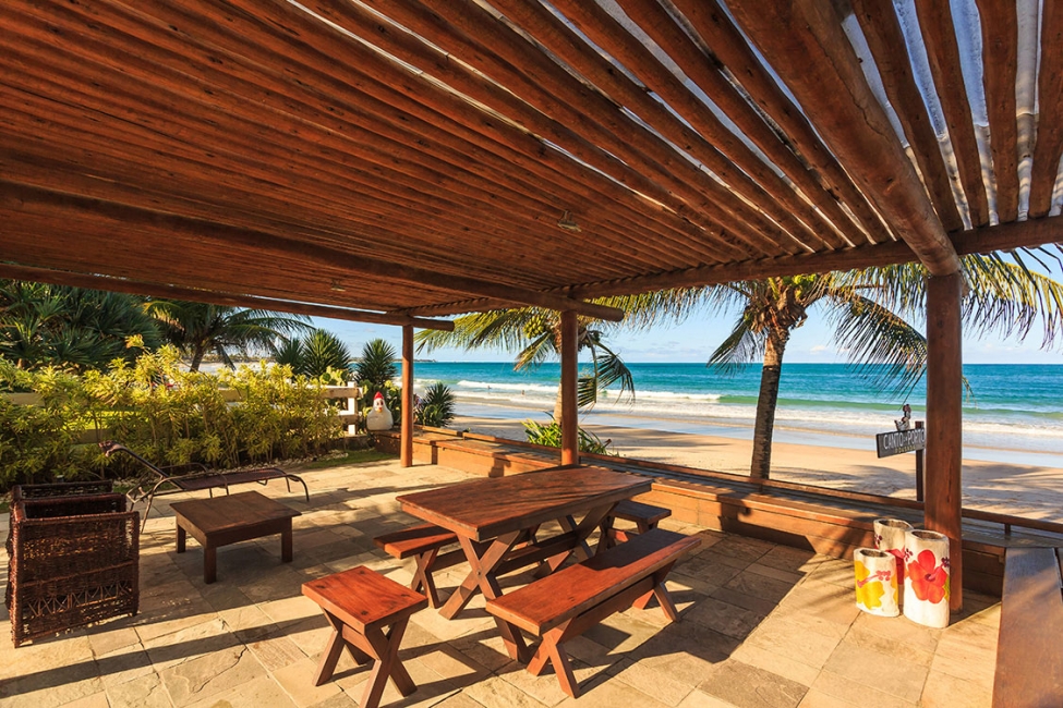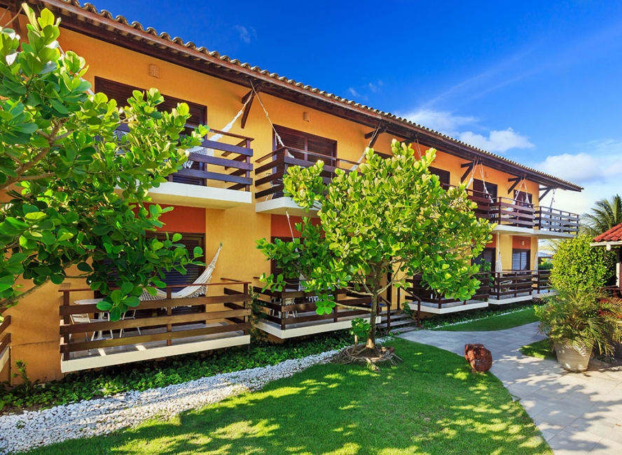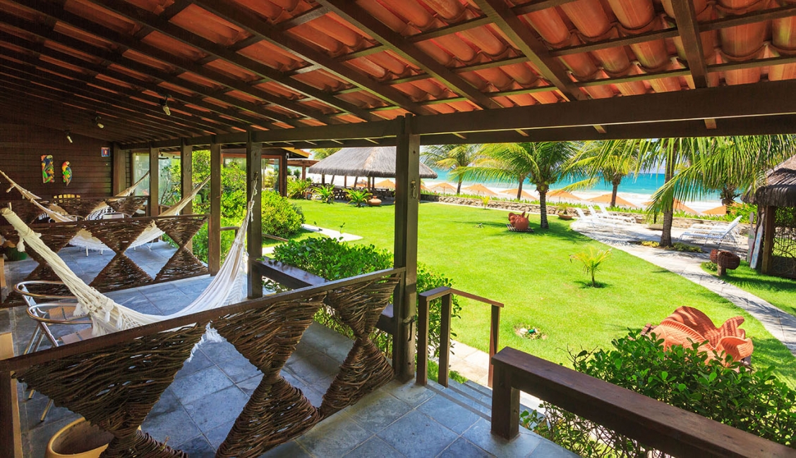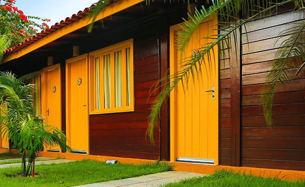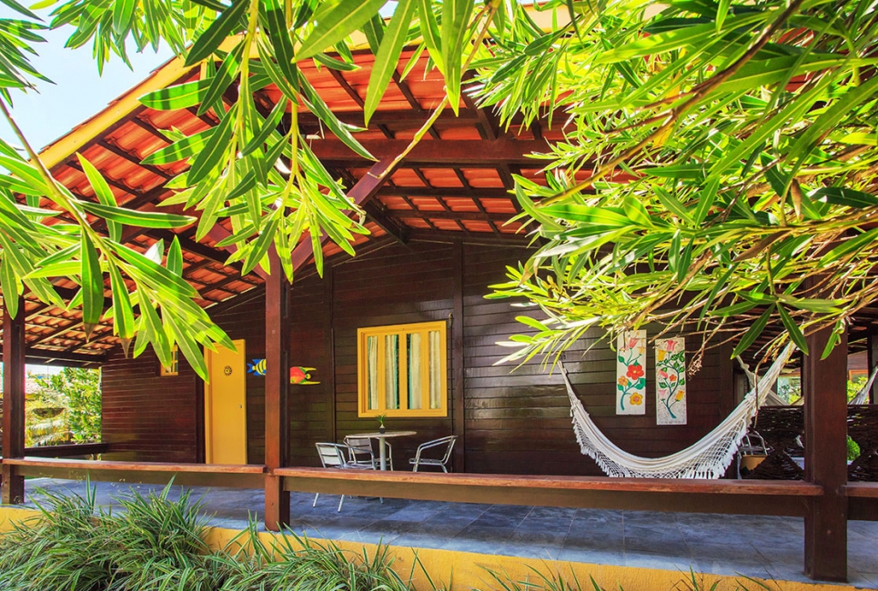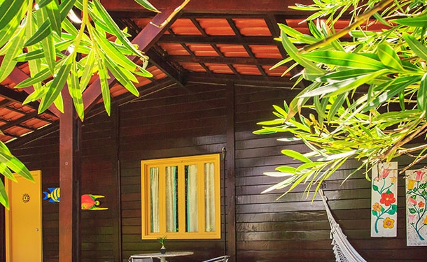 Construção em madeira, estilo rústico, onde estão dispostos quatro charmosos apartamentos, todos com varanda e rede de frente para o mar.