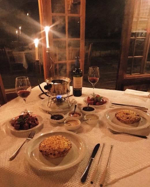 À noite, no aconchego da lareira e no romantismo da luz de velas, você encontra tranquilidade para degustar um bom vinho e saborear uma das deliciosas especialidades do nosso cardápio.