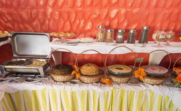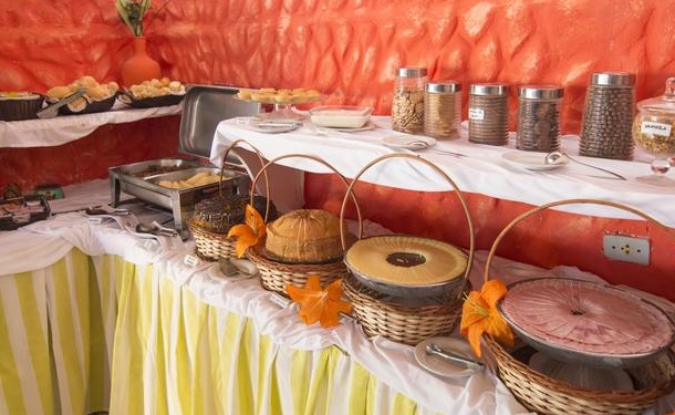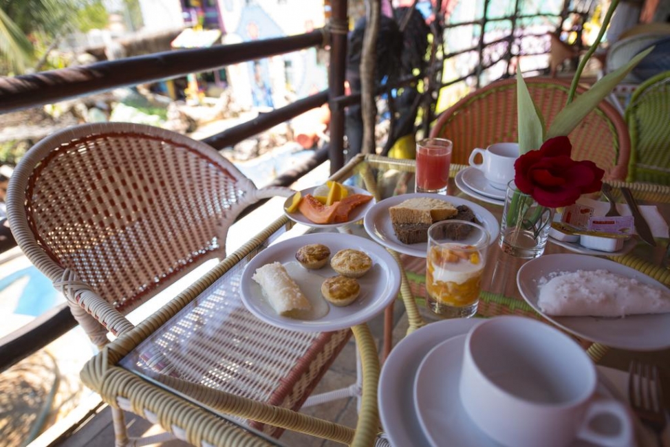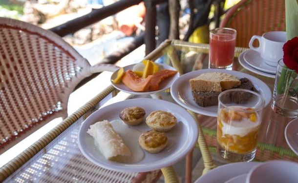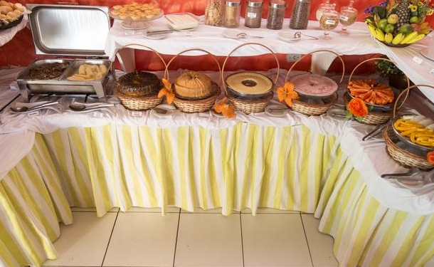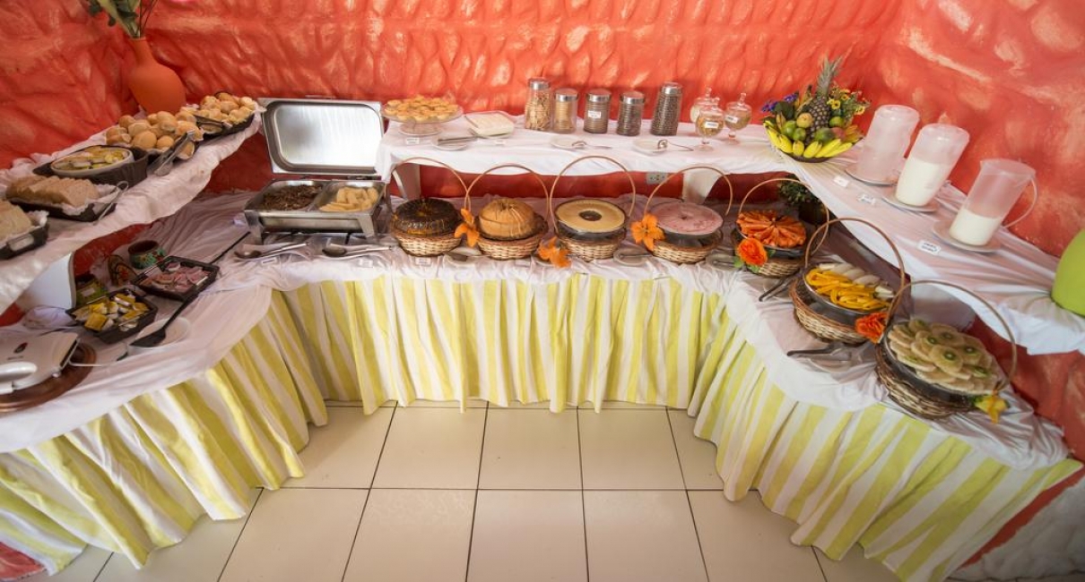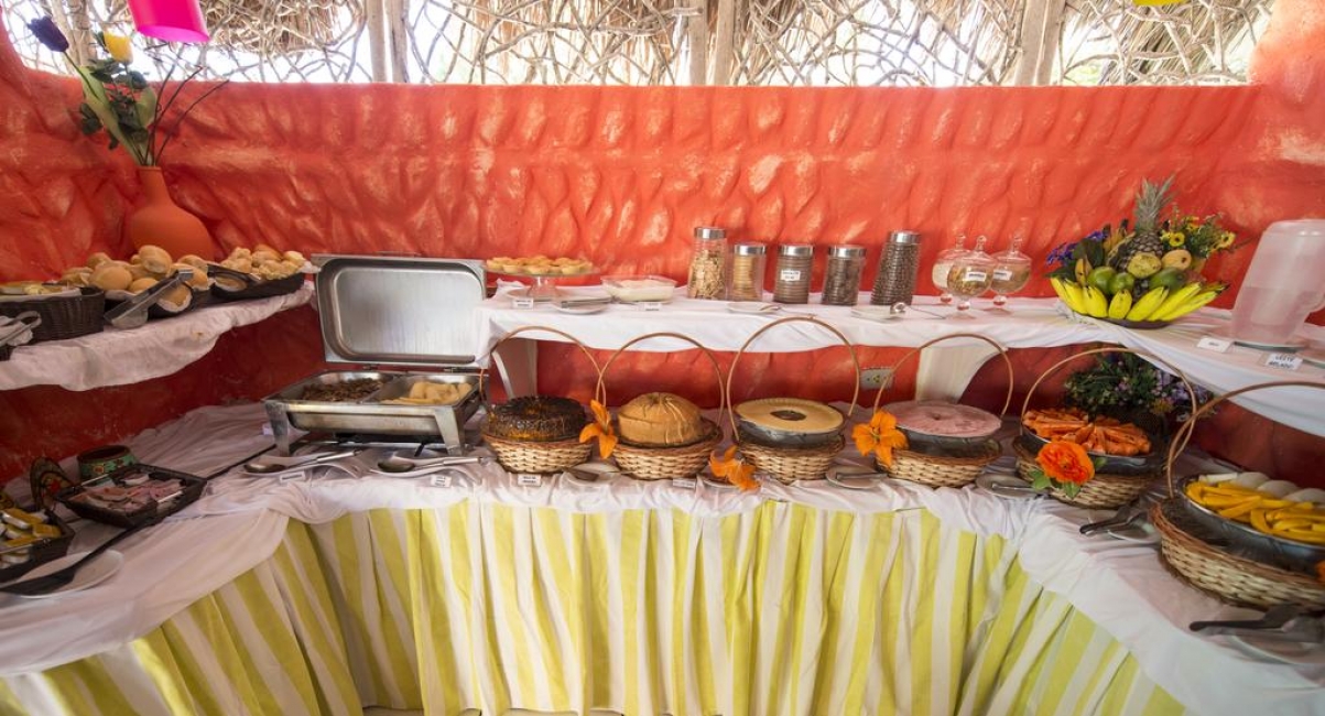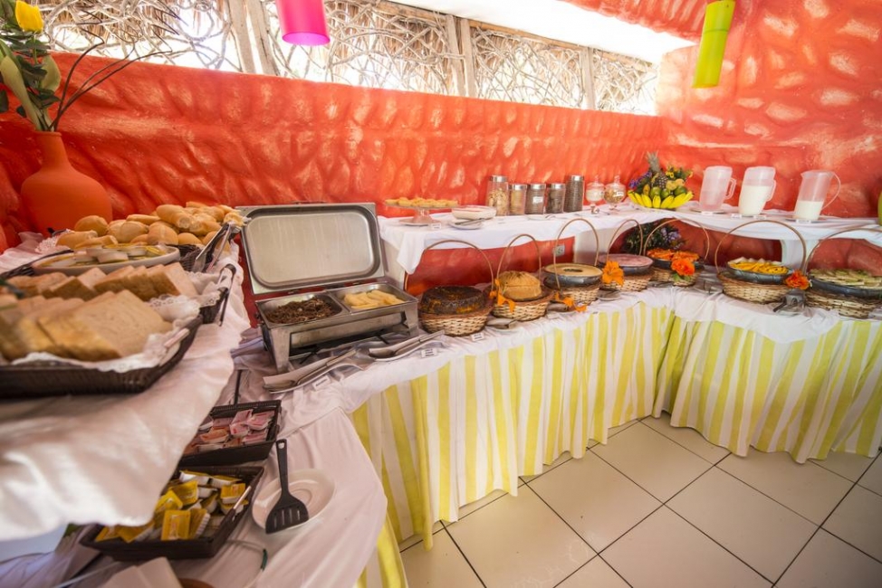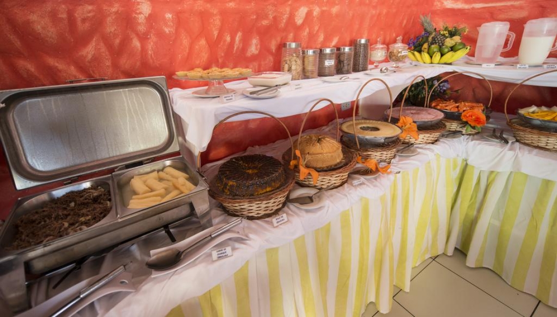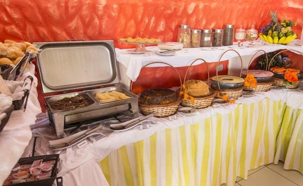 O café da manhã é servido no salão de refeições e inclui pães, bolos, frutas frescas, sucos, frios, bebidas quentes, ovos mexidos, omeletes e tapiocas feitas na hora. O estabelecimento possui um bar molhado que serve variadas bebidas, drinques, porções e lanches.