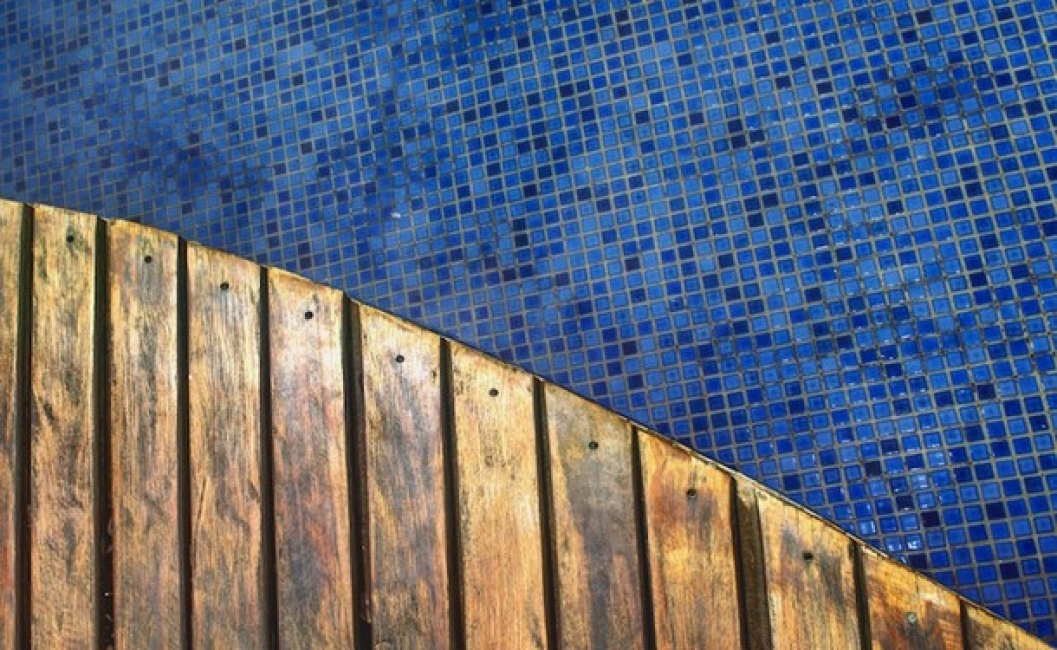 Ampla piscina com deck solarium, bar e ducha.