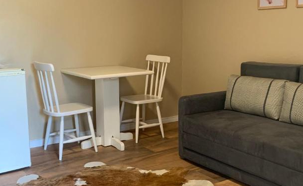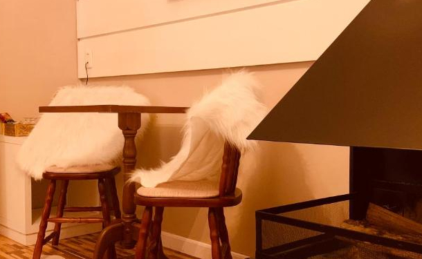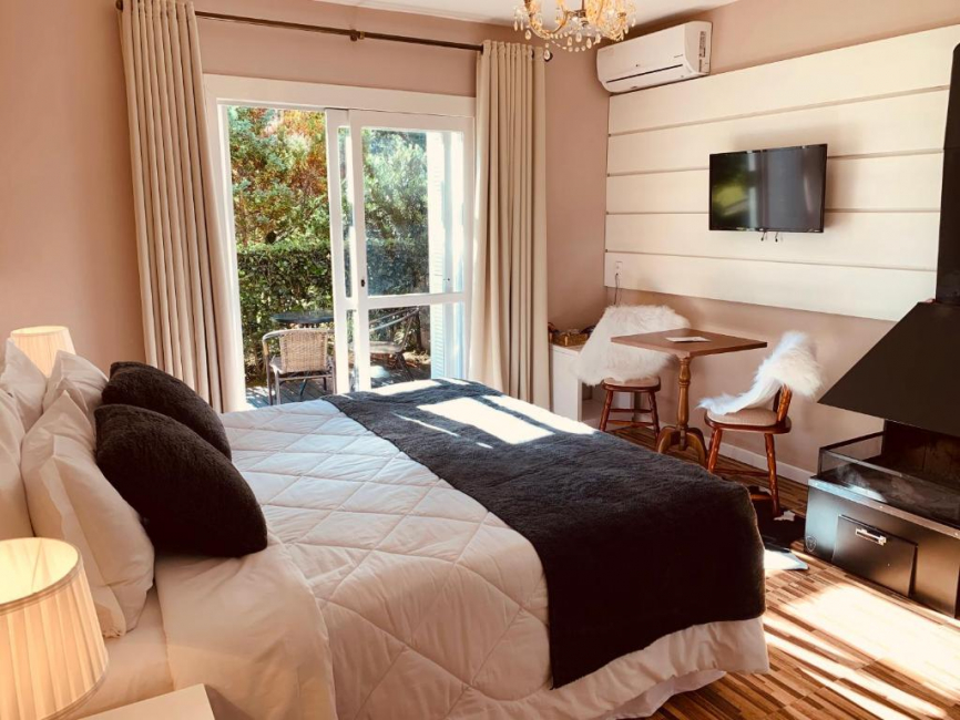 A acomodação possui 1 cama King Size, TV Smartv 32", Armário, mesa para refeições, Lareira de ferro, Secador de cabelo, Ar condicionado Quente/Frio, e decoração rústica.