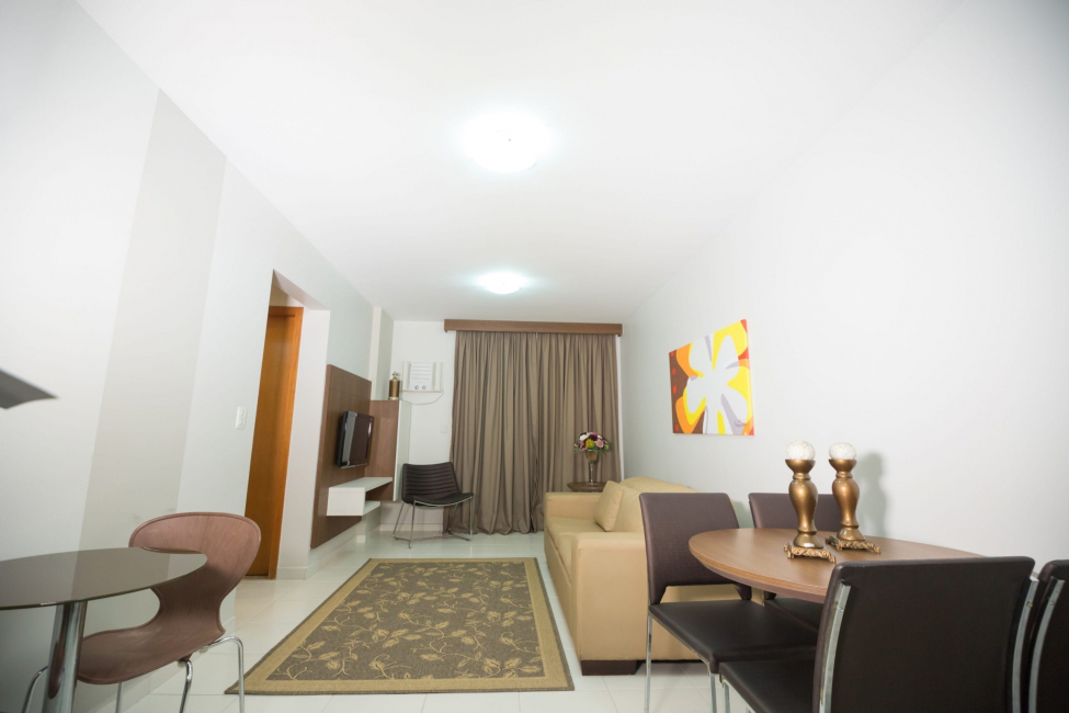 Quarto com armário, ar condicionado e uma cama de casal ou duas de solteiro e, na sala sofá-cama casal com TV. Acomoda confortavelmente quatro pessoas, sendo dois adultos e duas crianças ou até três adultos. Em estilo flat, os apartamentos possuem cozinha americana com armários, telefone, frigobar, micro-ondas e 01 (um) banheiro.