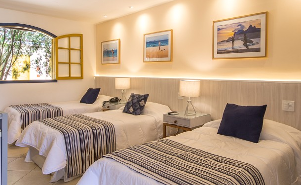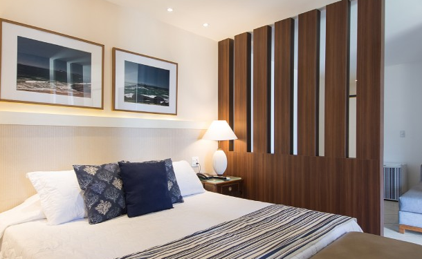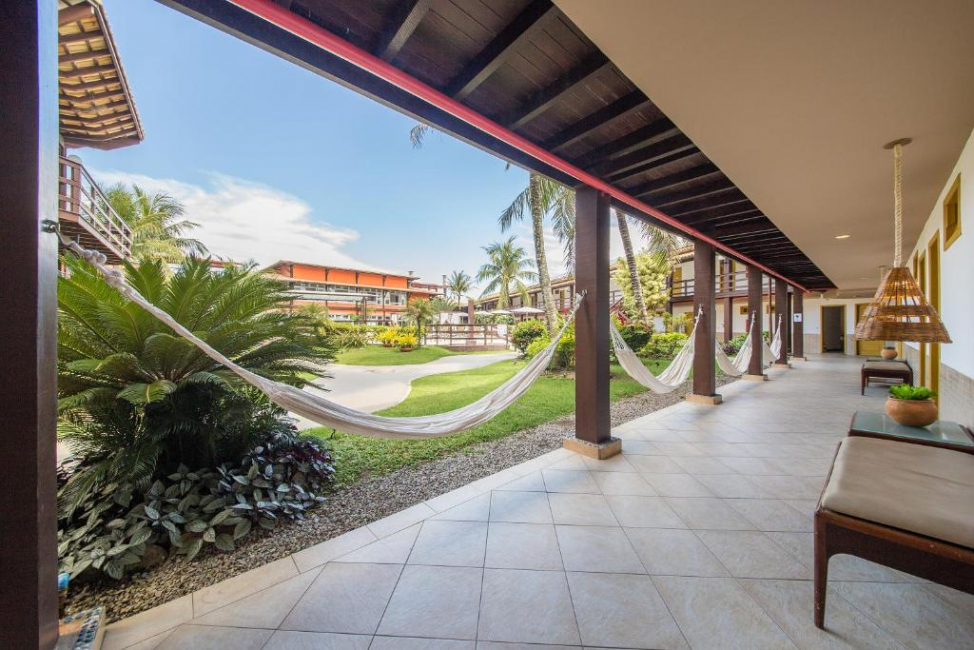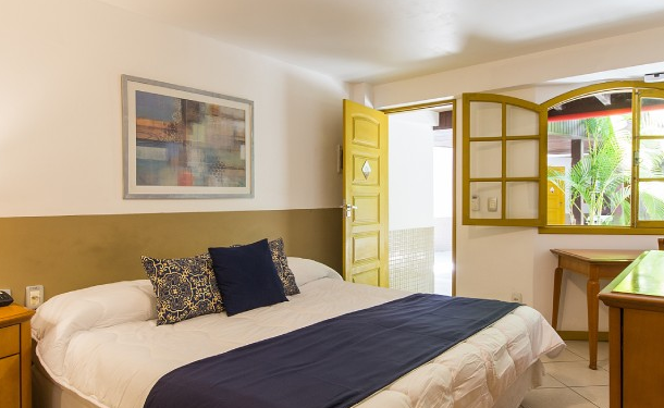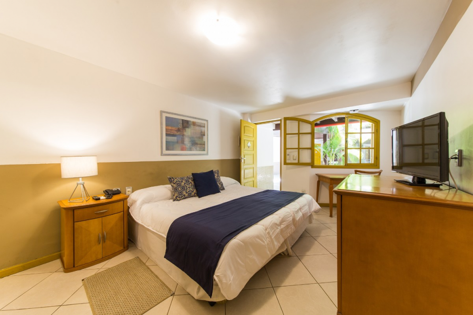 Amplo apartamento com varanda para o gramado e equipado com frigobar, ar condicionado, telefone, secador, wifi, TV a cabo e bancada para trabalho.