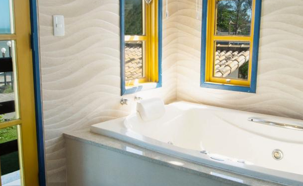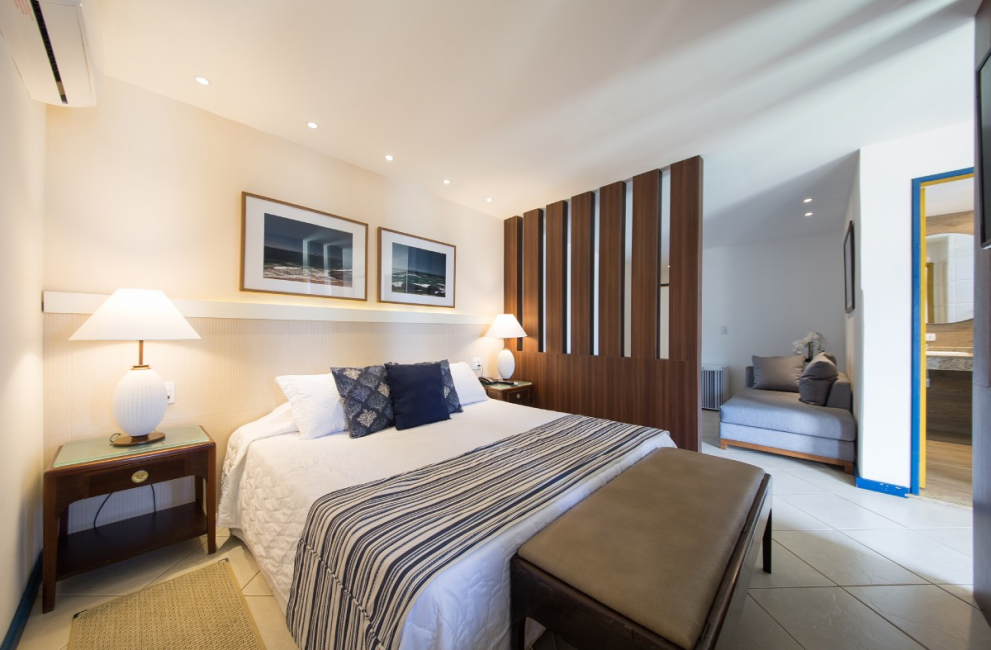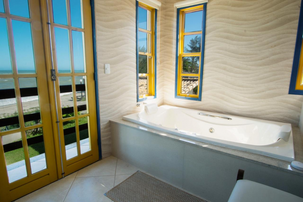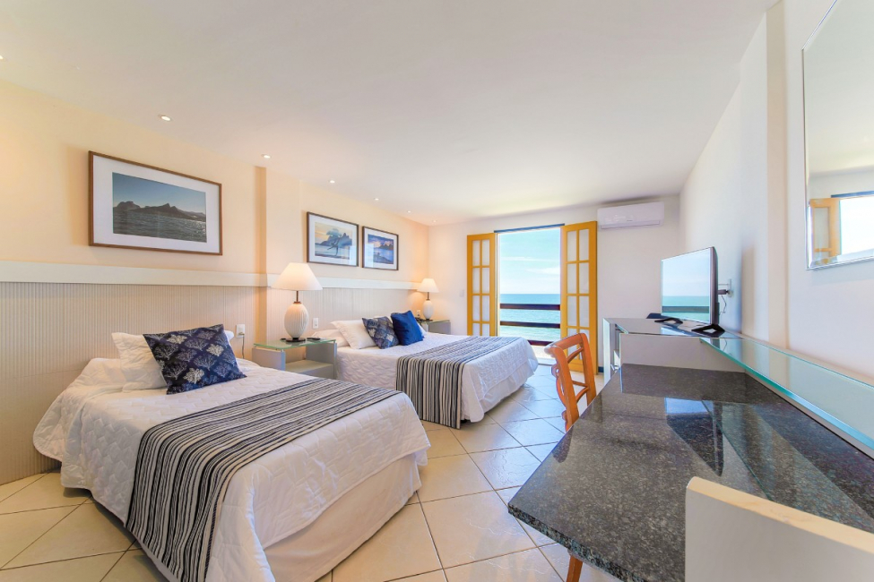 Amplo apartamento com banheira de frente pro mar, ante sala, mesa para café, decoração moderna e equipado com frigobar, ar condicionado, telefone, secador de cabelo, wifi e TV a cabo.