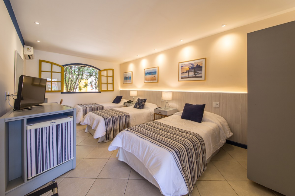 Apartamento com janela para o interior do hotel, equipado com frigobar, ar condicionado, telefone, secador, wifi e tv a cabo.