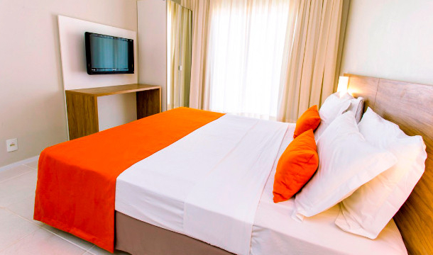 Apartamento de 72m², com 2 quartos, sendo 1 suíte, copa, frigobar, forno micro-ondas, TV a cabo na sala e suíte, ar-condicionado, cofre, secador de cabelos e varanda. Acomoda 4 adultos e 2 crianças de até 12 anos ou 5 adultos.