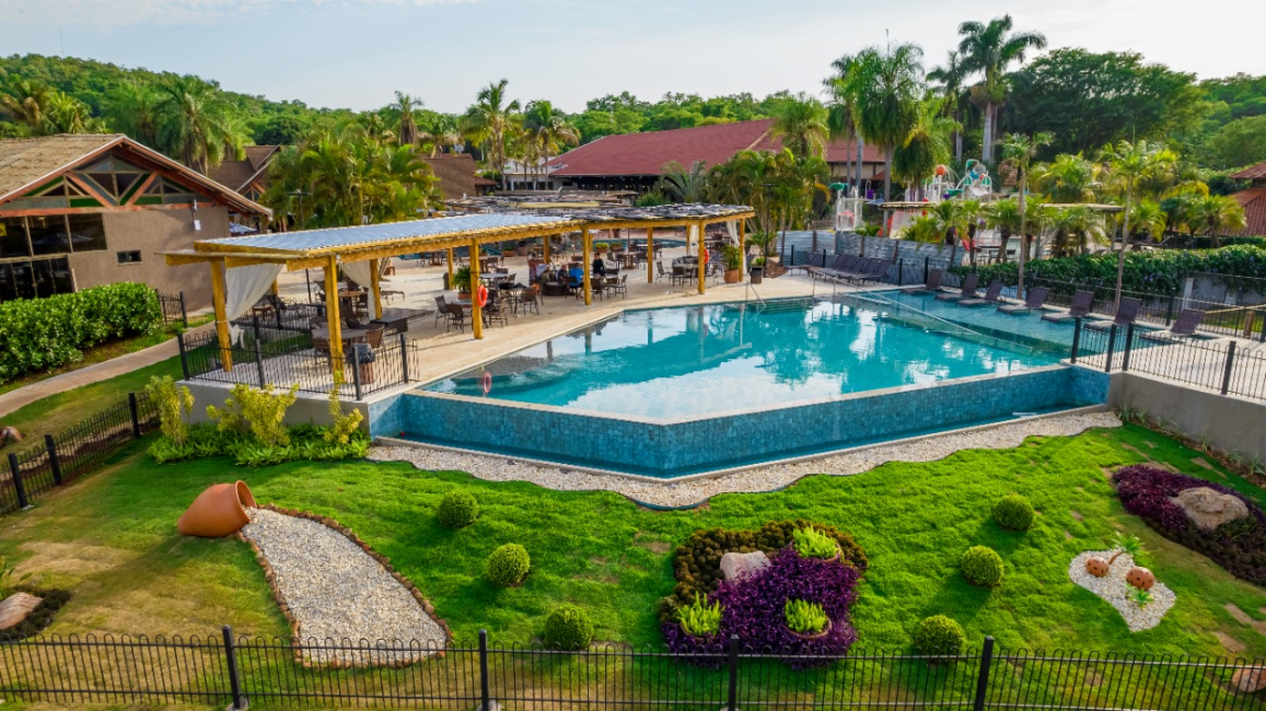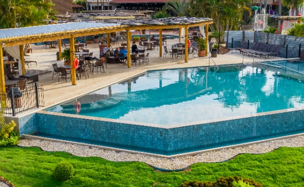- Duas piscinas tropicais, uma para adultos, com cascata permanente, e outra para crianças.